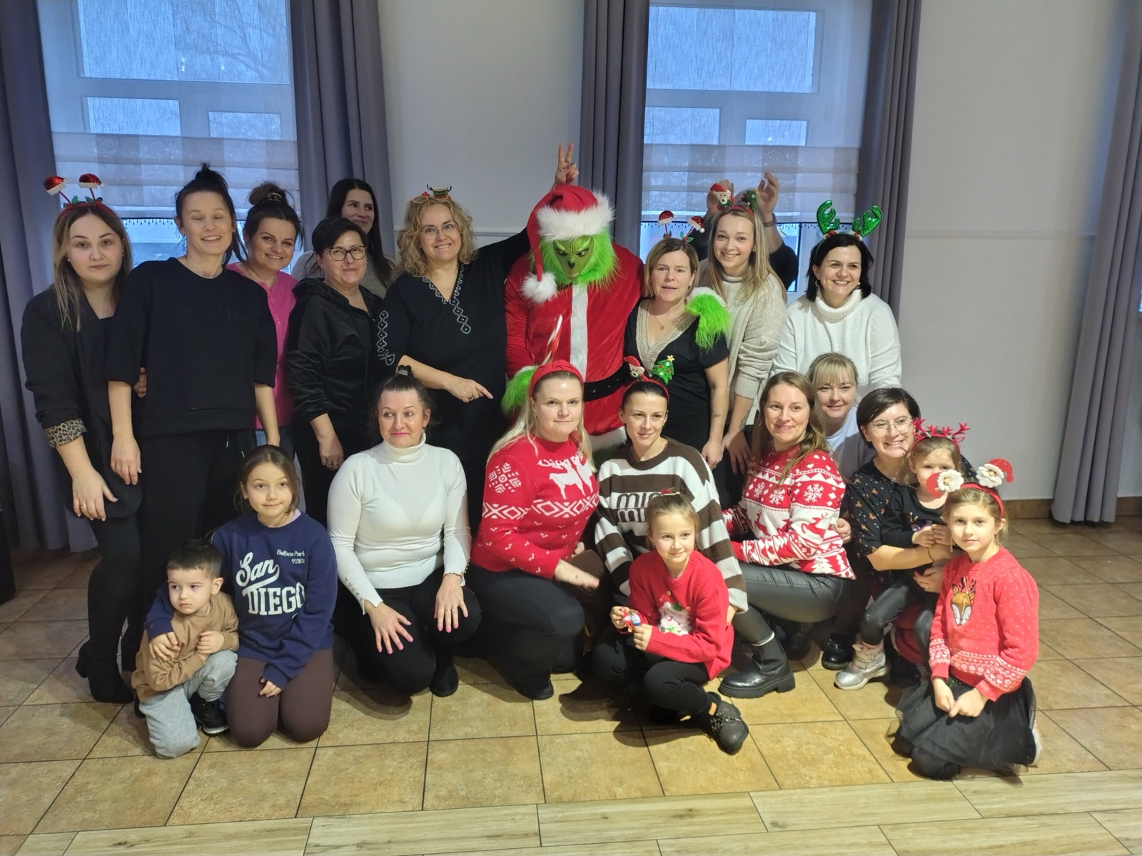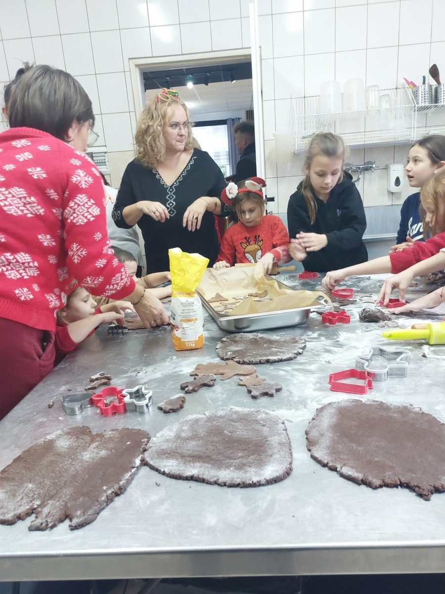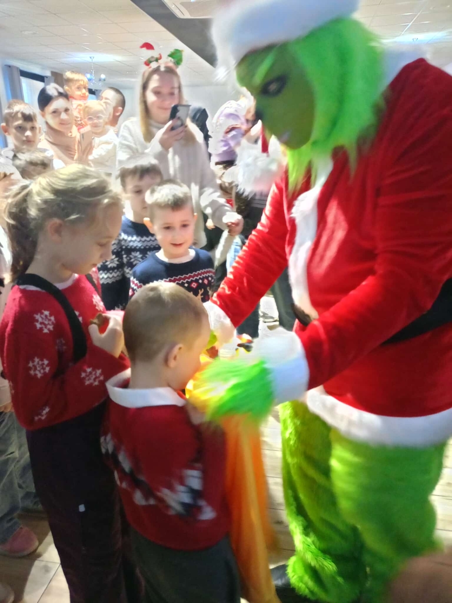 Następnie dzieci przystąpiły do dekorowania pierniczków, jednak największą frajdę sprawiło im samodzielne wałkowanie i wykrawanie ciasteczek. W międzyczasie na salę OSP wkroczył gość niespodzianka - Grinch, który częstował dzieci cukierkami i chętnie pozował do zdjęć.